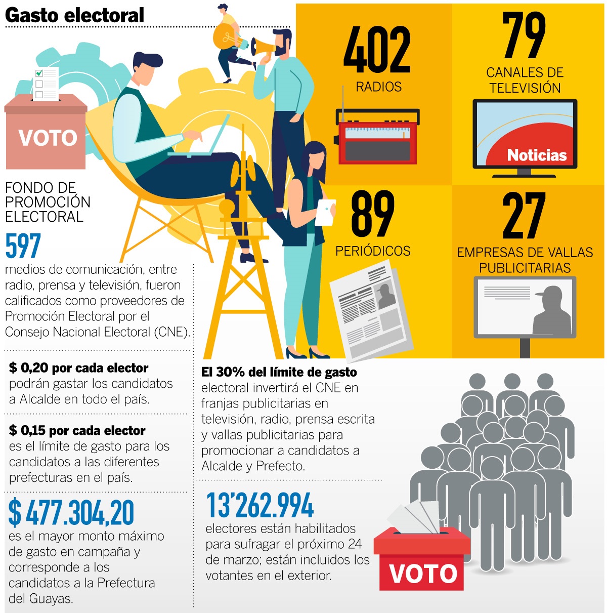 En ambos casos hay límites. El numeral 5 del artículo 209 del Código de la Democracia establece que los candidatos a alcaldes, por ejemplo, deben gastar $ 0,20 por cada elector del cantón que buscan dirigir. En cambio, el numeral 3 establece para los que disputan las prefecturas un gasto de $ 0,15 por sufragante.