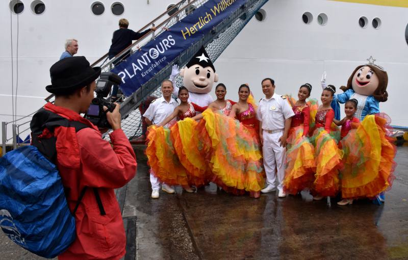 Una comitiva encabezada por los personajes guayaquileños Juan y Juanita Pueblo recibió a las 08:00 de ayer con un cálido baile folclórico a unos 431 pasajeros extranjeros, en su mayoría alemanes, en el crucero Hamburg, que llegó al Puerto Marítimo de Guayaquil.